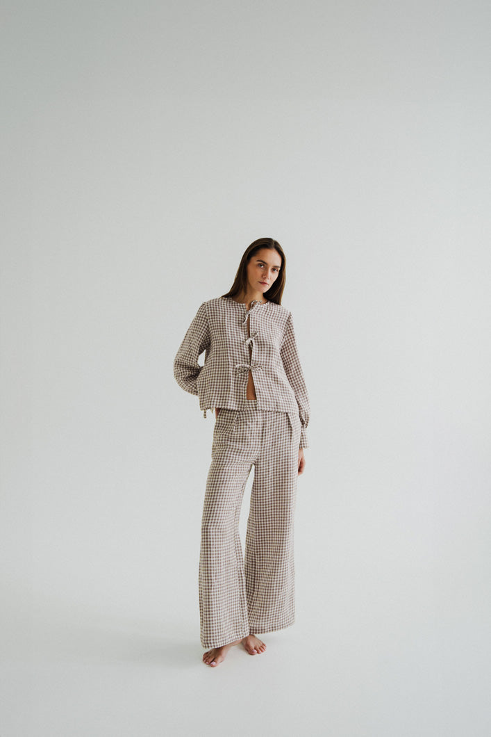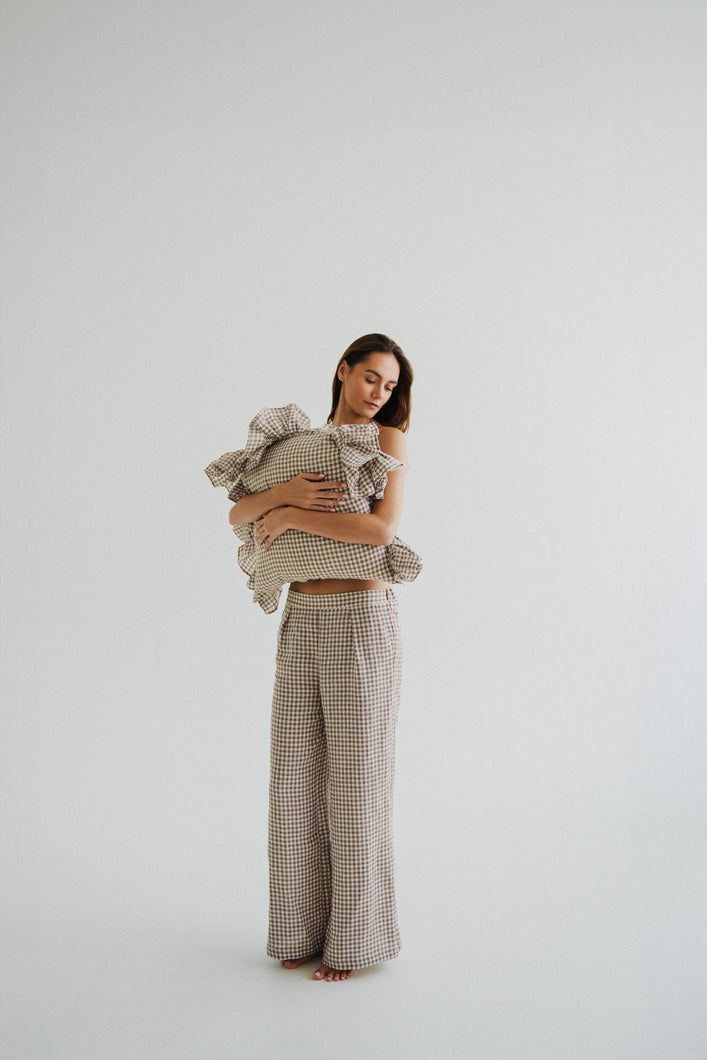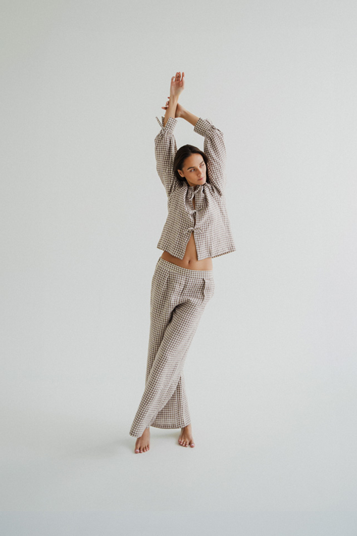 Lniane spodnie w skandynawską kratę. Luźny "cool" fason, wygodna guma w pasie i eleganckie zakładki sprawiają, że ten model jest idealny do spania, a jeżeli zestawisz je z ulubioną bluzą czy koszulką, możesz spędzić w nich cały weekend.