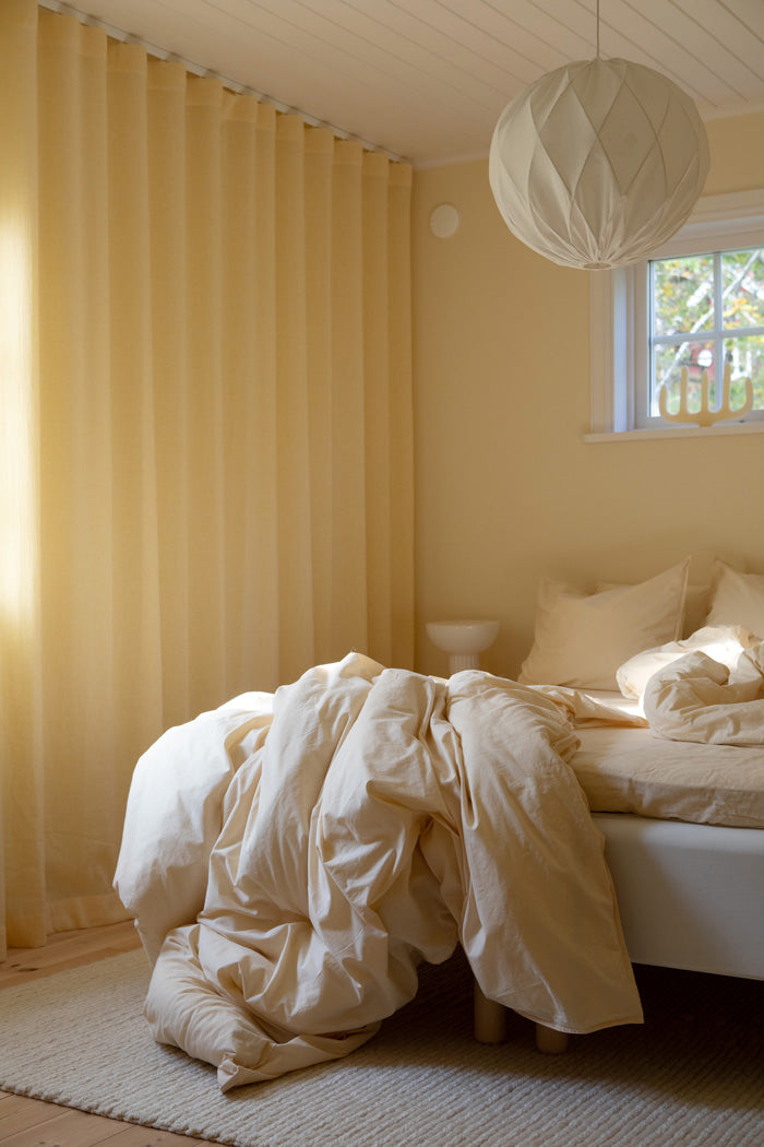 Poszewka na kołdrę z super miękkiej bawełny organicznej w kolorze maślanym. Ten kolor jest jaśniejszy od żółtego, ale głębszy od wanilii. Wprowadza ciepło i koi zmysły, jest idealnym tłem na długie wieczory i leniwe poranki w ulubionej pościeli.