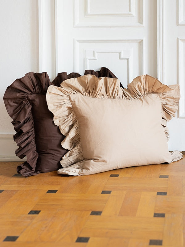 Ten wyjątkowy komplet dwóch poszewek w kolorze beżowym to nasz kultowy model z falbanami, który zachwyca. Były używane wyłącznie do sesji zdjęciowych, dzięki czemu jest w doskonałym stanie.
