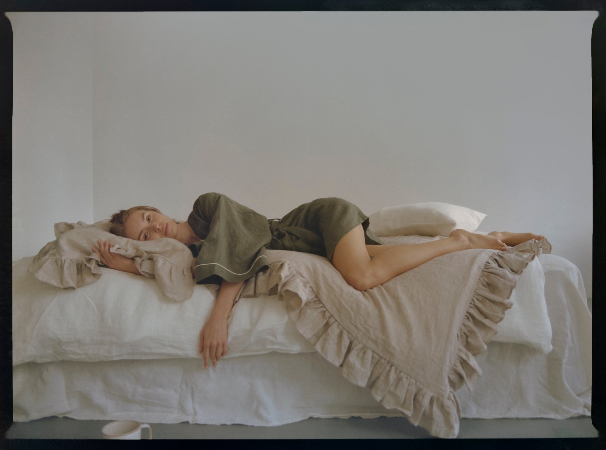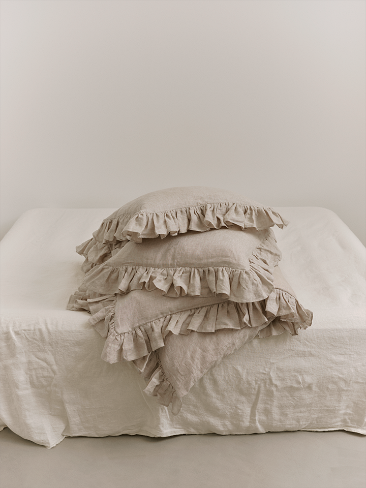 Komplet pościeli z romantycznymi falbanami z lnu. Ten model doskonale sprawdzi się zarówno w minimalistycznych nowoczesnych wnętrzach jak i tych klasycznych z nutą vintage.
